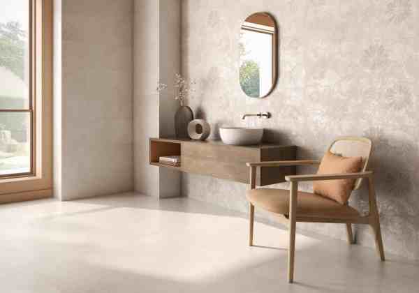 Destaca por su diseño decorativo con un relieve floral que aporta elegancia y sofisticación, combinando la calidez del tono beige con un patrón distintivo que enriquece visualmente cualquier ambiente.