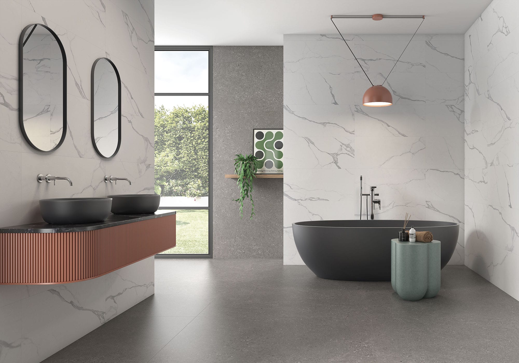 Azulejo cerámico satinado inspirado en el mármol estatuario, presenta un fondo blanco con vetas sutiles que aportan luminosidad y amplitud a los espacios