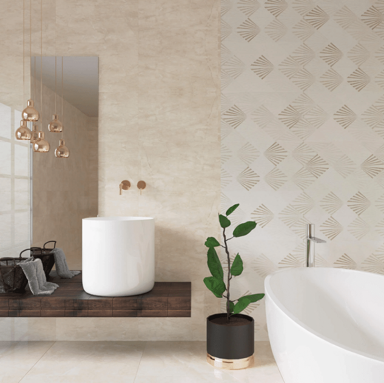 Es una opción elegante y versátil para revestimientos interiores. Con su tonalidad crema cálida y acabado brillante, aporta luminosidad y sofisticación a diversos espacios.