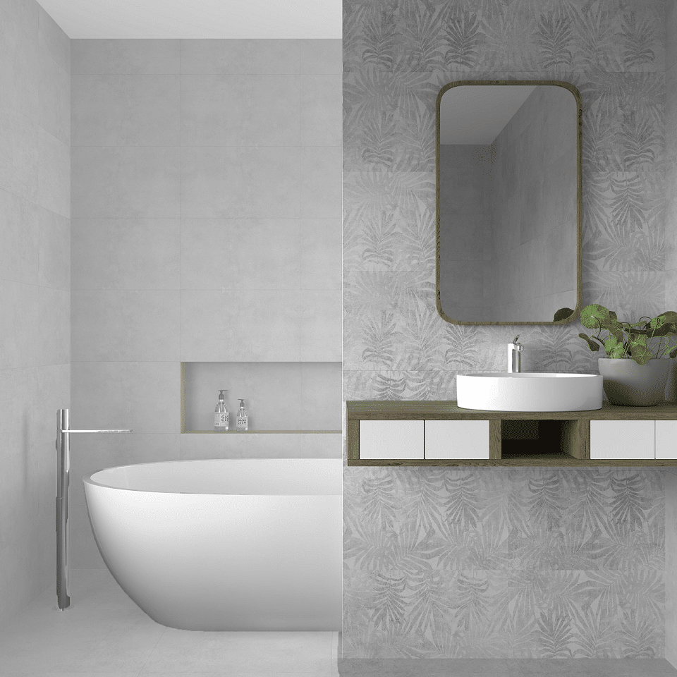 Este azulejo presenta una impresión digital que emula cemento y piedra en un elegante tono gris perla, logrando un estilo contemporáneo y mediterráneo que se adapta a diversos ambientes como baños, cocinas y espacios comerciales, aporta una sensación de sofisticación y naturalidad.
