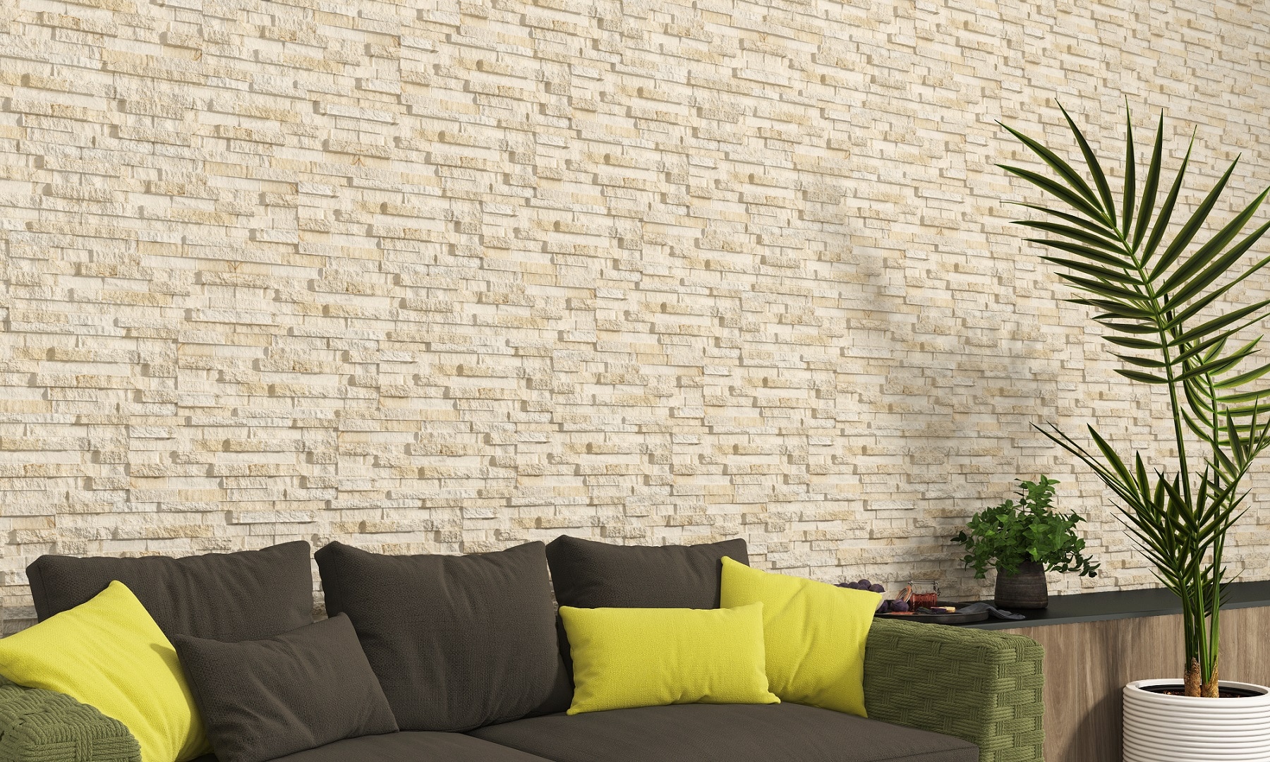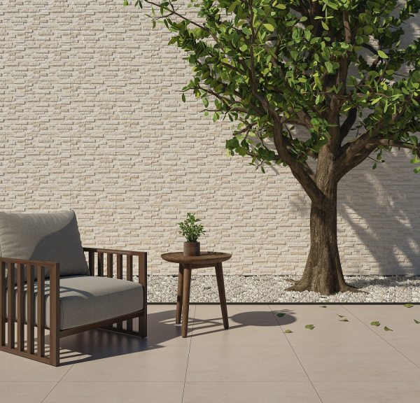 Fachaleta porcelánica imitación piedra, para interiores y exteriores.