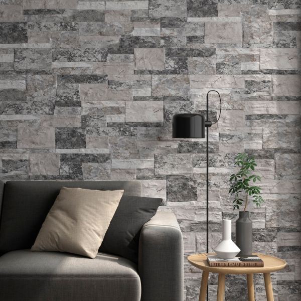 Imita con gran realismo la textura y tonalidad de la piedra natural. Su acabado en tonos grises oscuros, con matices grafito, aporta profundidad y sofisticación a cualquier ambiente