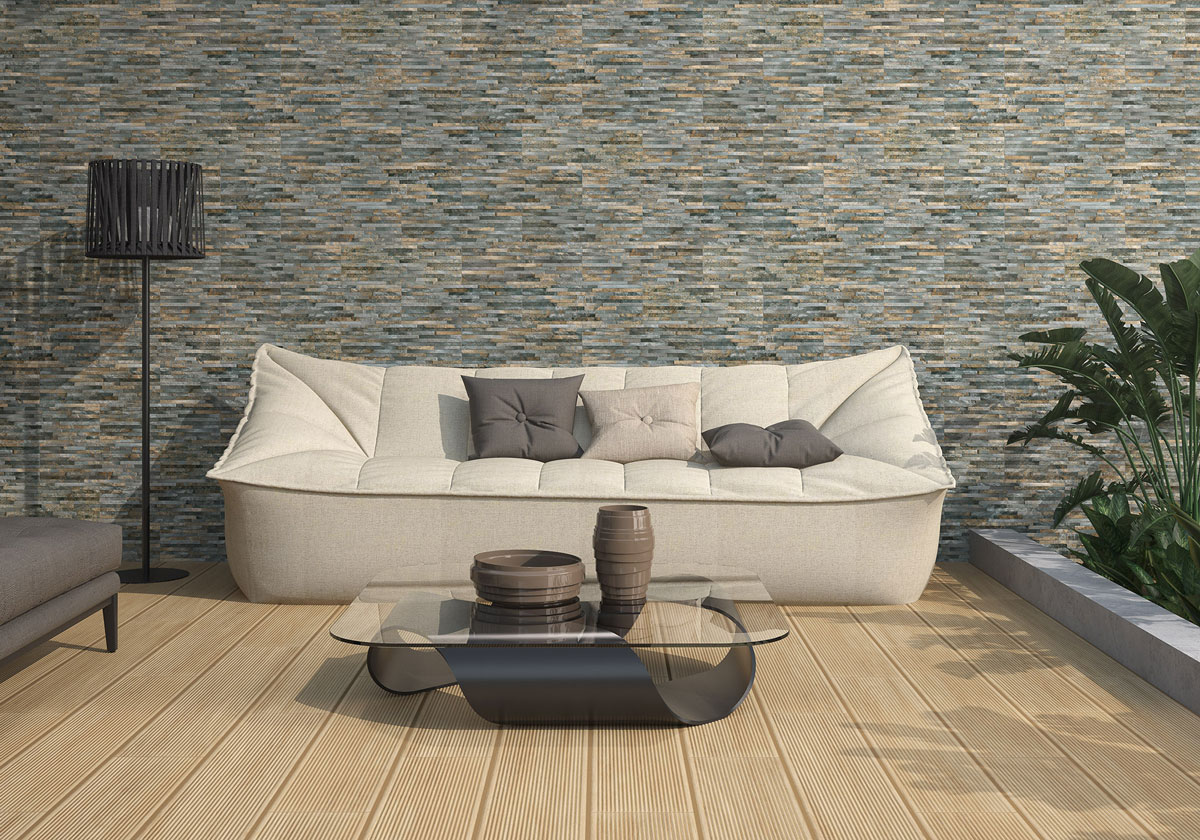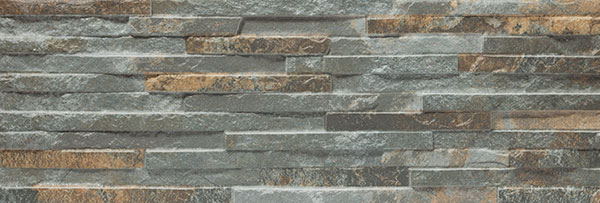 Fachaleta porcelánica imitación piedra, para interiores y exteriores.