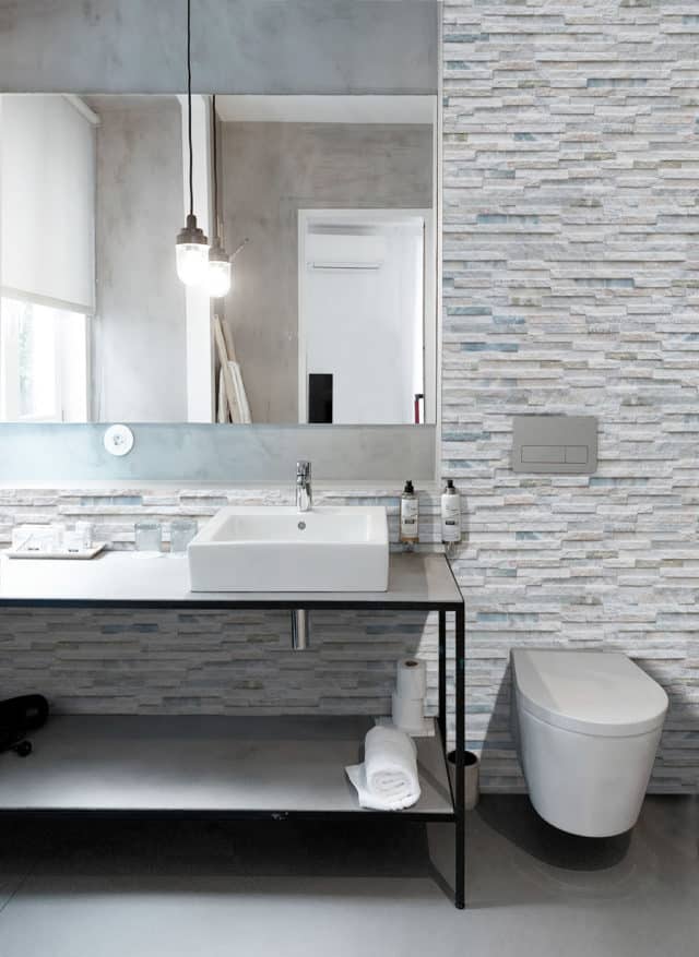Fachaleta porcelánica imitación piedra, para interiores y exteriores.