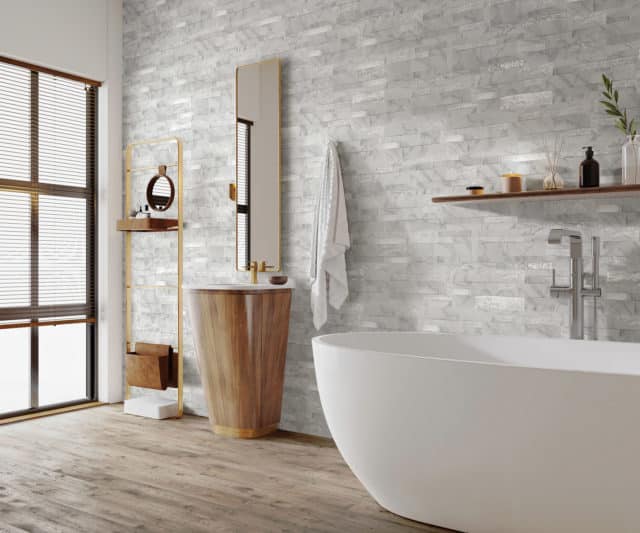 Fachaleta porcelánica imitación piedra, para interiores y exteriores.