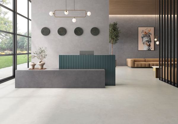 Se inspira en la estética del concreto pulido, ofreciendo una interpretación suave y luminosa del estilo industrial contemporáneo, una superficie sutil y neutra que aporta serenidad y sofisticación a los espacios. Su tonalidad perla, un gris claro con matices cálidos, lo convierte en una base versátil para diversos estilos de diseño.