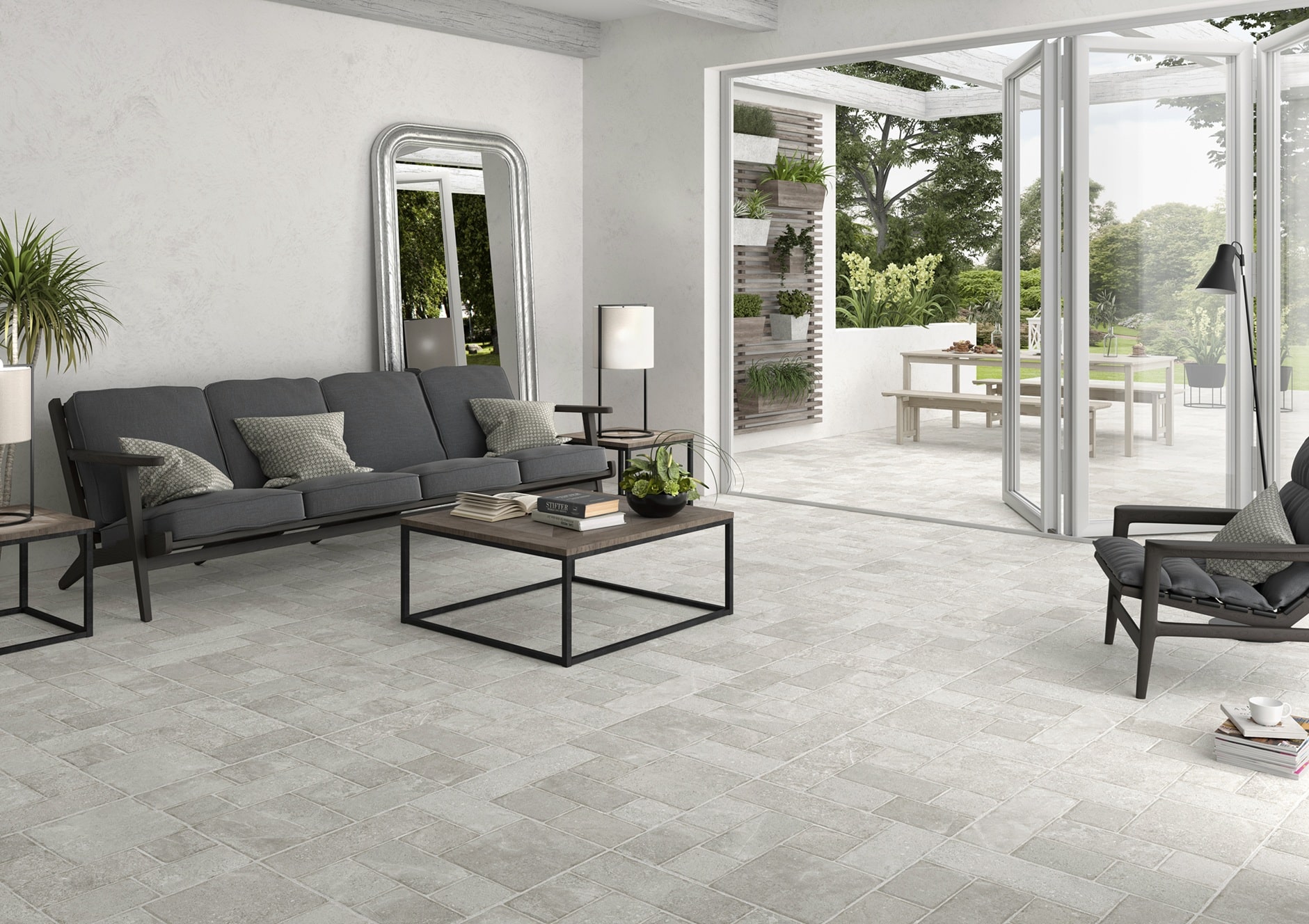 Evoca la elegancia industrial y minimalista del cemento pulido o la piedra natural gris, perfecto para crear espacios serenos, contemporáneos y amplios. Con tecnología Nanotech que proporciona una superficie antideslizante (especialmente activada en contacto con agua) pero con un tacto suave y agradable.