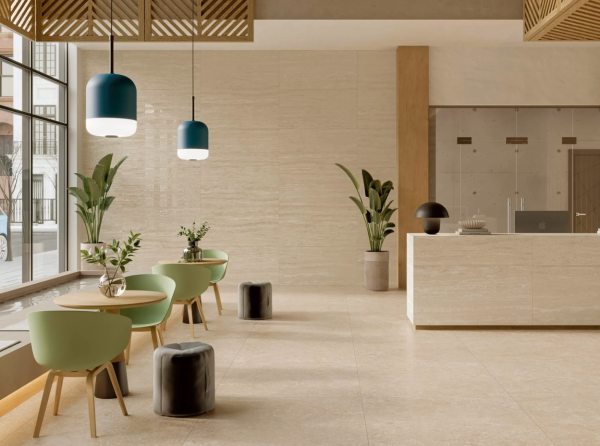 Es una opción elegante que emula la belleza del travertino cortado en veta, ofreciendo una estética moderna y natural.