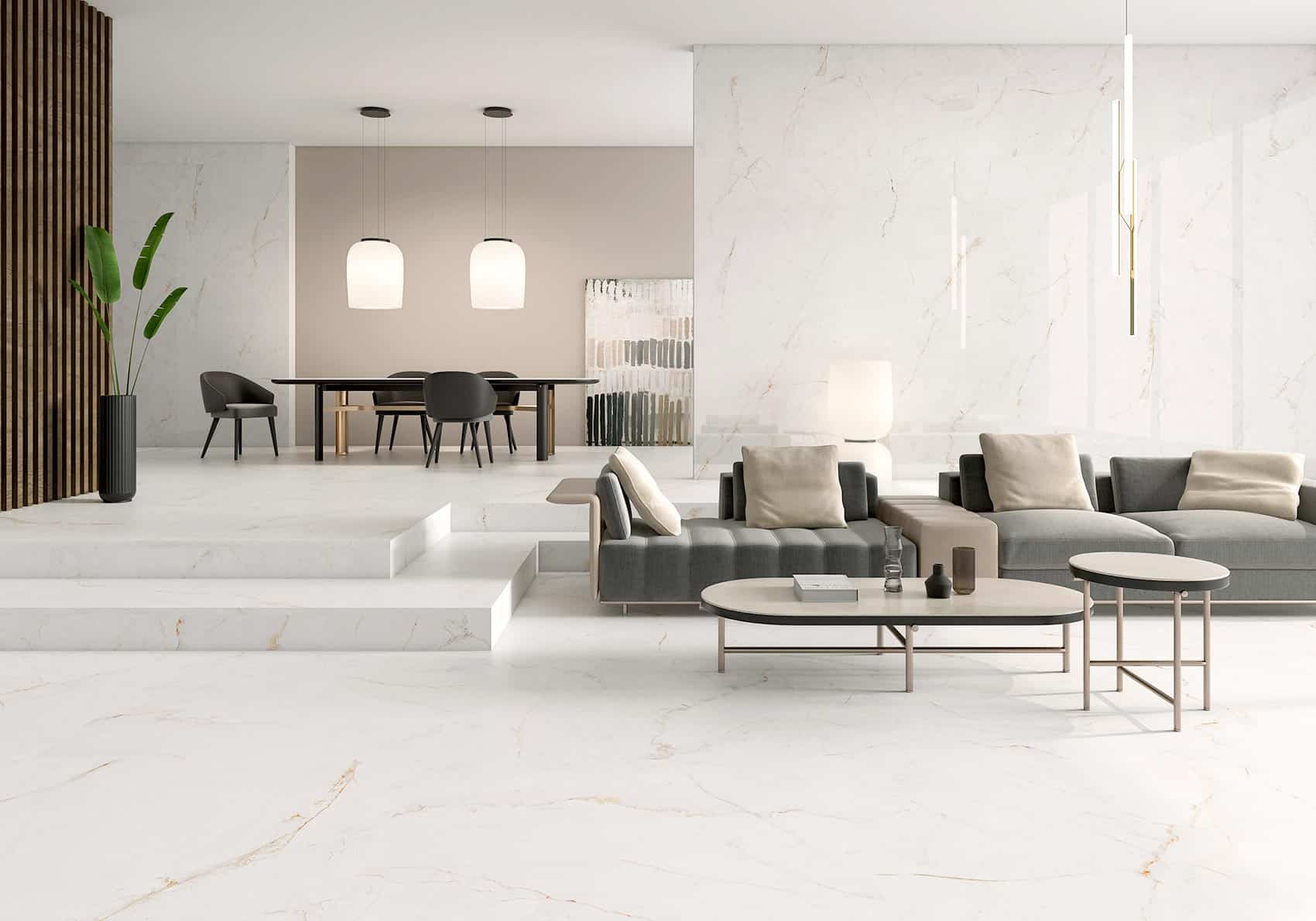 Se inspira en la elegancia atemporal del mármol dolomita, ofreciendo una estética sofisticada y versátil para diversos espacios interiores. Recrea la belleza del mármol con vetas doradas y cobrizas que aportan dinamismo y profundidad visual.