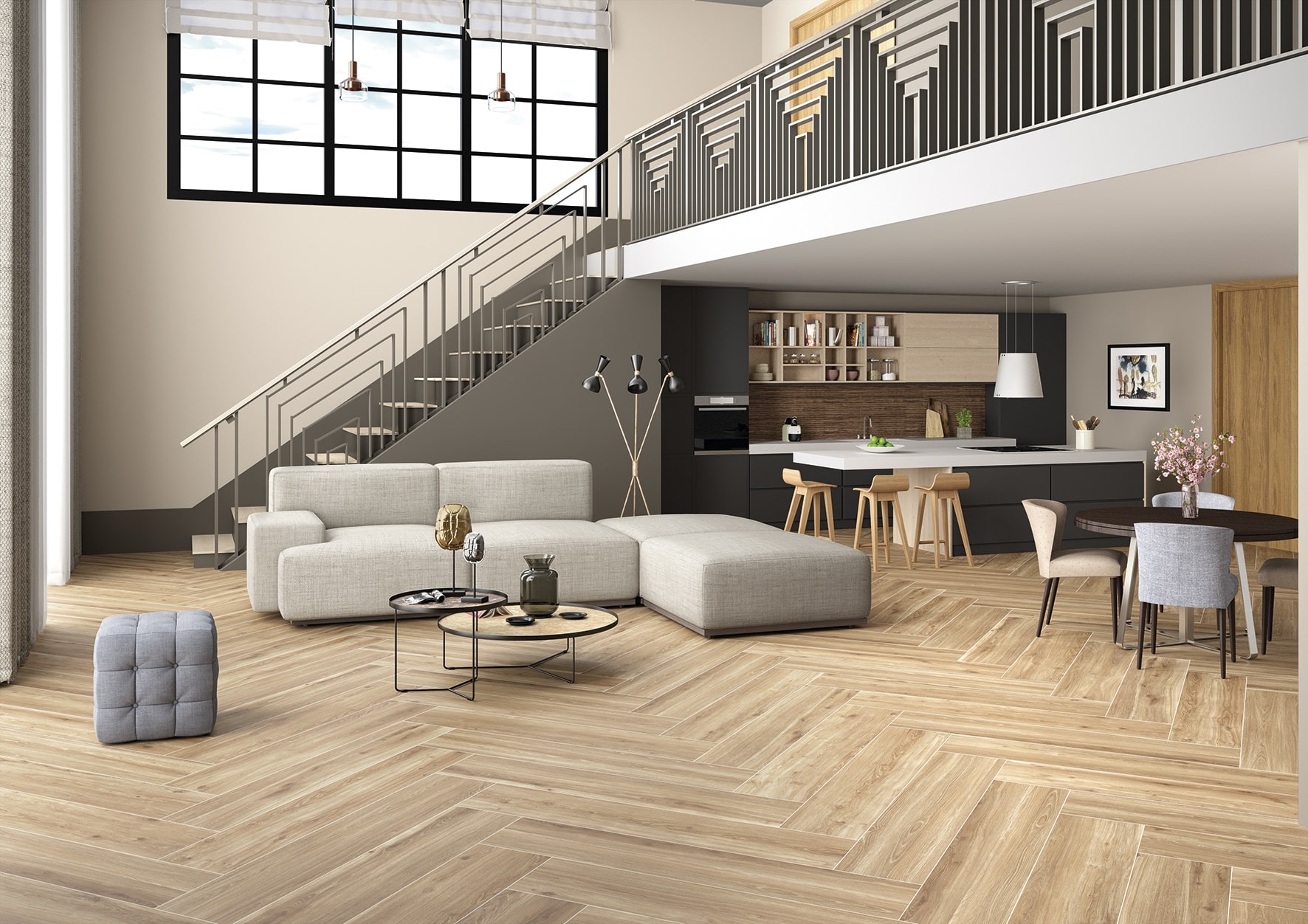 Es una elegante opción que combina la calidez de la madera natural con la resistencia y practicidad del porcelanato. Su tonalidad miel evoca la riqueza de maderas como el roble o el nogal, con vetas sutiles y variaciones tonales que aportan profundidad y realismo.