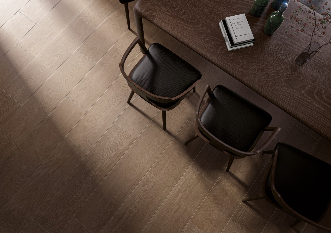 Es una colección que fusiona la elegancia clásica de la madera de nogal con la resistencia y versatilidad del porcelanato. Evoca la profundidad y calidez de la madera de nogal, con tonos que van desde marrones achocolatados hasta reflejos dorados, perfectos para espacios con personalidad.